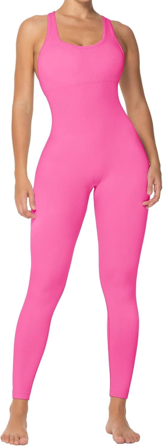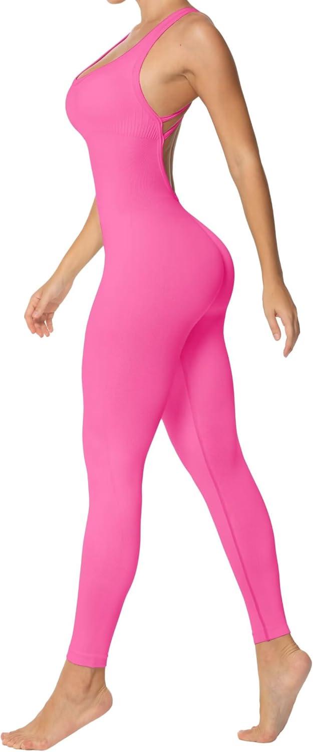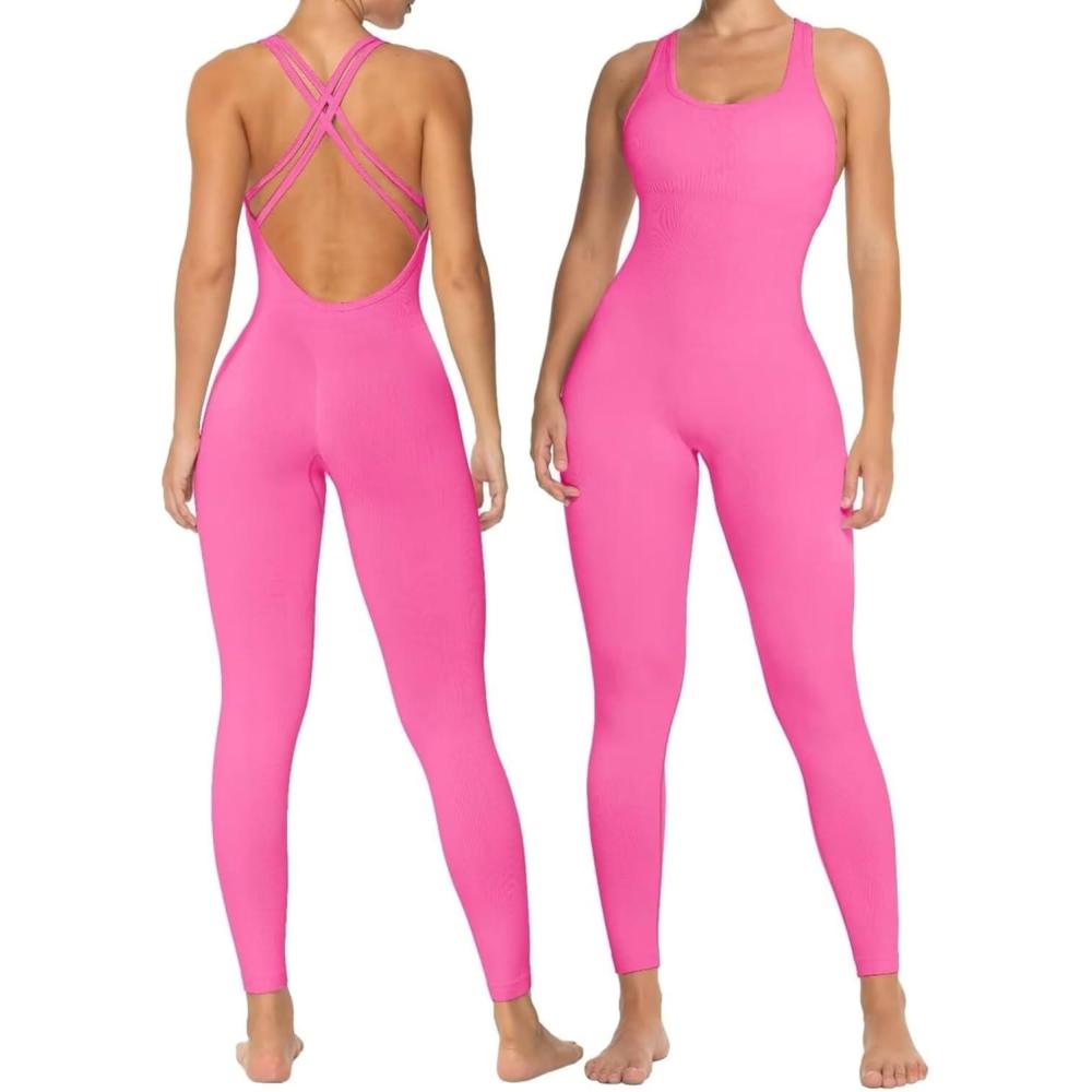Sunzel Jumpsuits for Women Backless, Seamless Workout One Piece Bodycon Bodysuits, Butt Scrunch Leggings Unitard(Hot Pink)