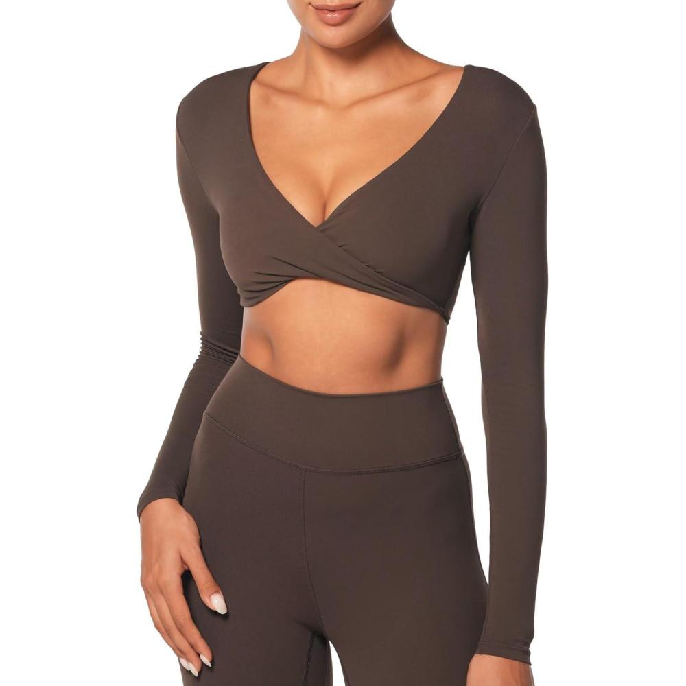 Sunzel Long Sleeve Workout Tops for Women Buttery Soft Deep V Twist Cropped Tops with Compression for Yoga Pilates Gym Outfit(Seal Brown)