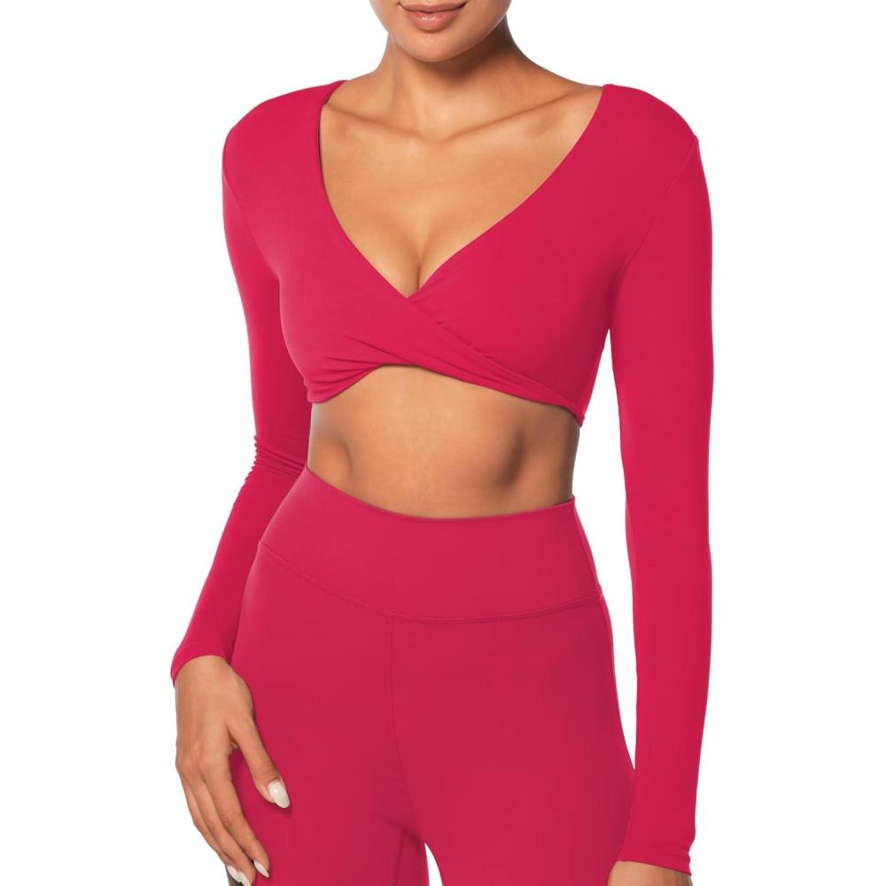 Sunzel Long Sleeve Workout Tops for Women Buttery Soft Deep V Twist Cropped Tops with Compression for Yoga Pilates Gym Outfit(Viva Magenta)