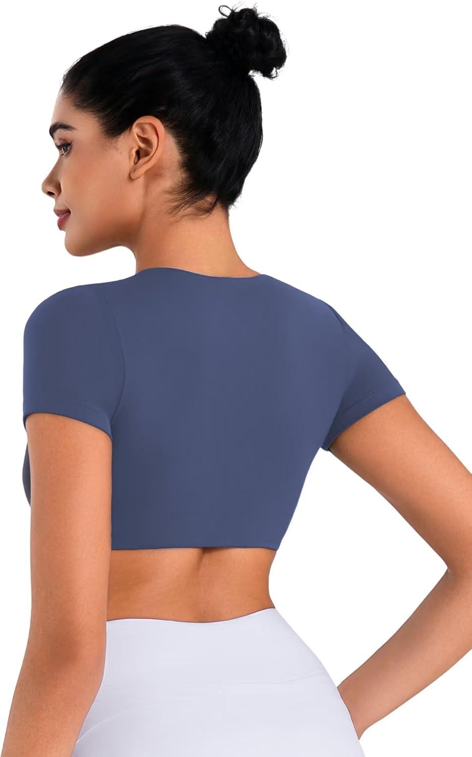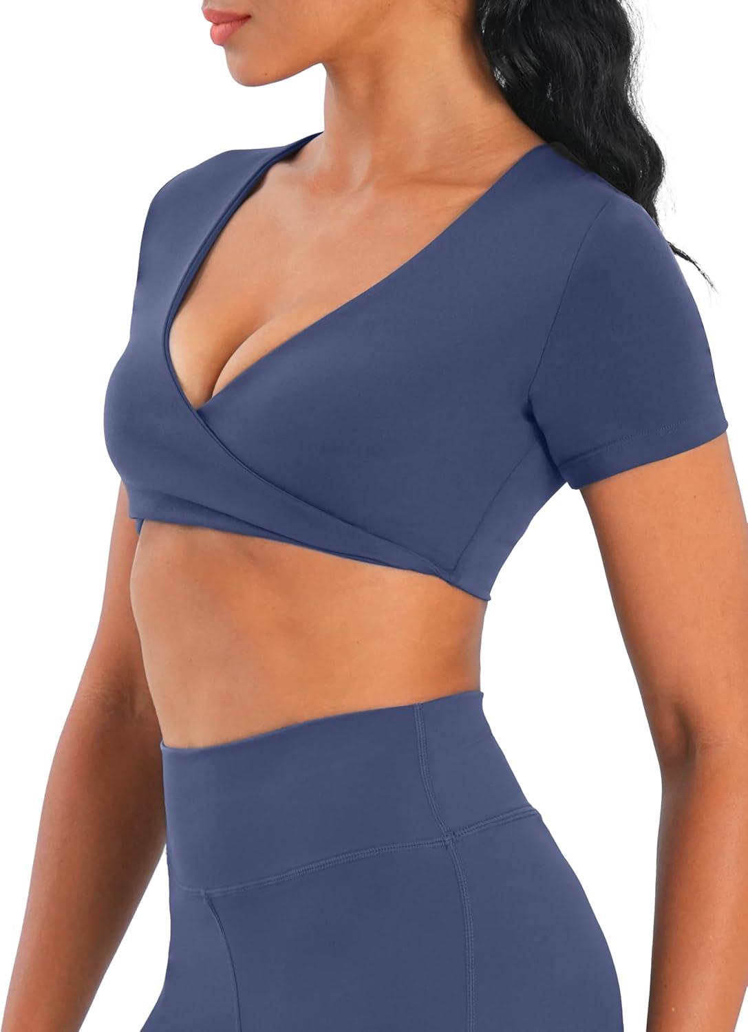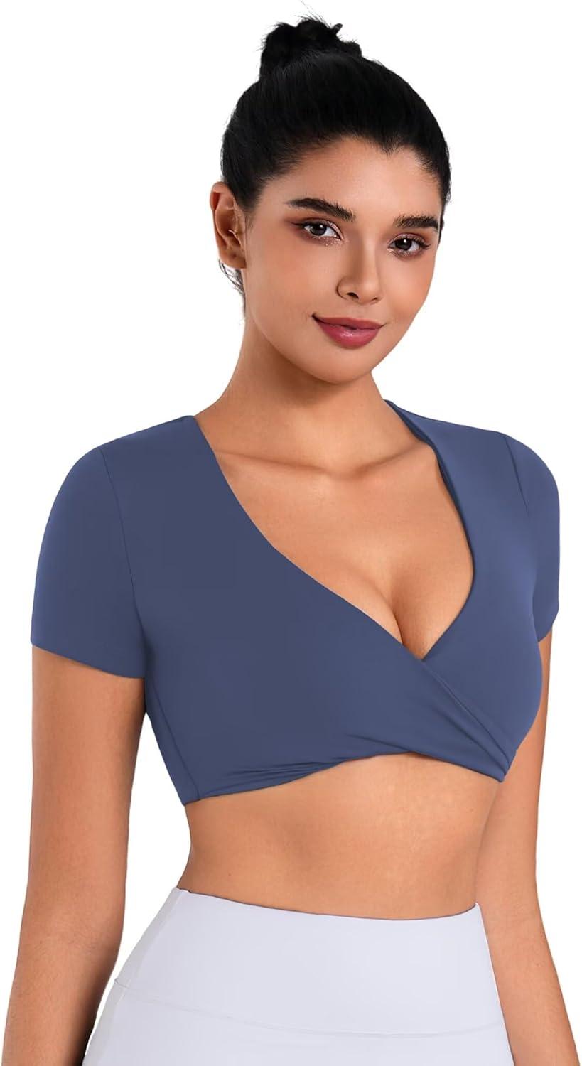 Sunzel Women’s Twist Deep V Workout Tops Summer Crop Gym Tops Buttery Soft Short Sleeve Shirts for Yoga Athletic Pilates(Ash Blue)